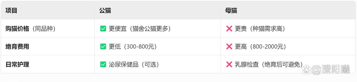 • 预算有限?公猫更划算(购猫+绝育更便宜)。