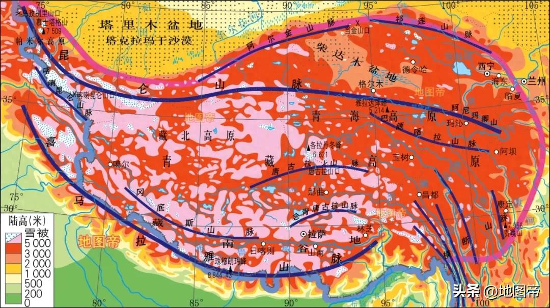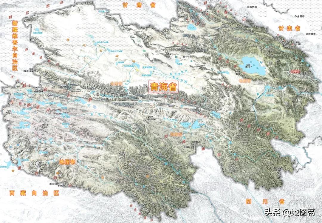 青海地貌复杂多样,西部为高原和盆地,东部多山,分布冰川、戈壁、沙漠、草地、水域、林地、耕地等。青海山脉纵横,峰峦重叠,自北往南有祁连山脉、昆仑山脉、阿尼玛卿山、巴颜喀拉山脉、唐古拉山脉等横亘,平均海拔3000米以上。青海最高峰是西部昆仑山脉的布喀达坂峰,海拔约6860米。