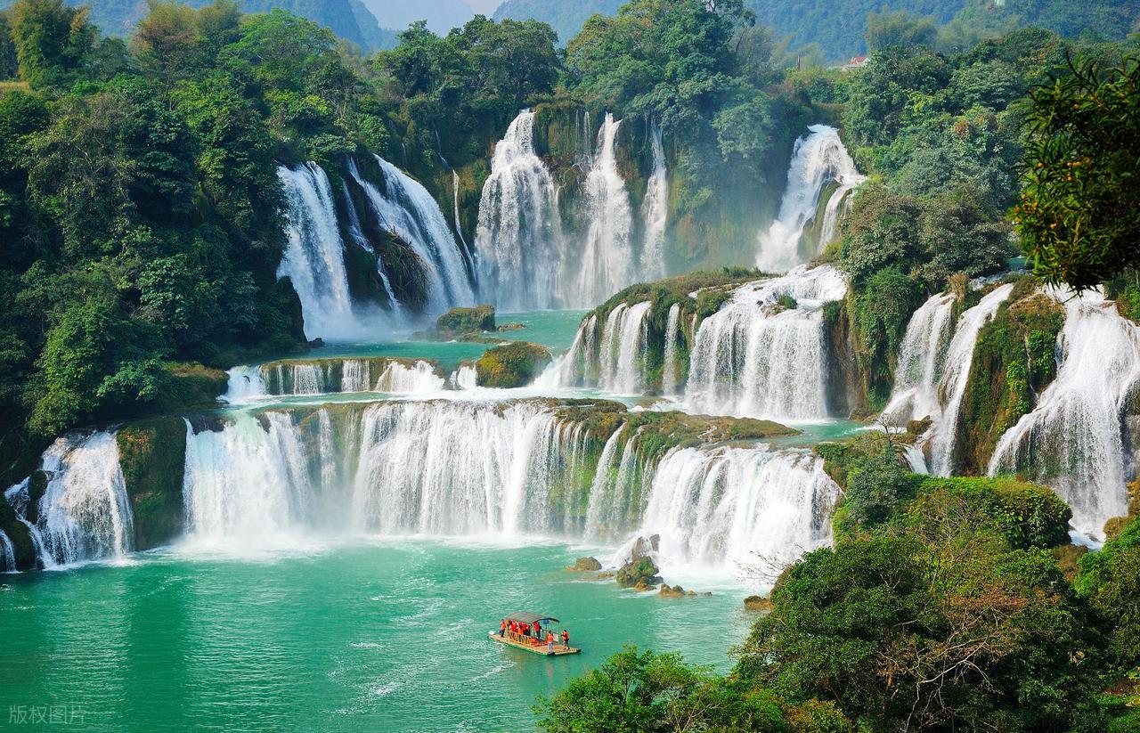 八九月正值峡谷瀑布丰水期,自然景观更加震撼。明仕田园的村落中片片稻田,明仕河畔翠竹绕岸。德天瀑布年四季青山绿水,坐竹筏到瀑布下,水雾铺面的清凉。