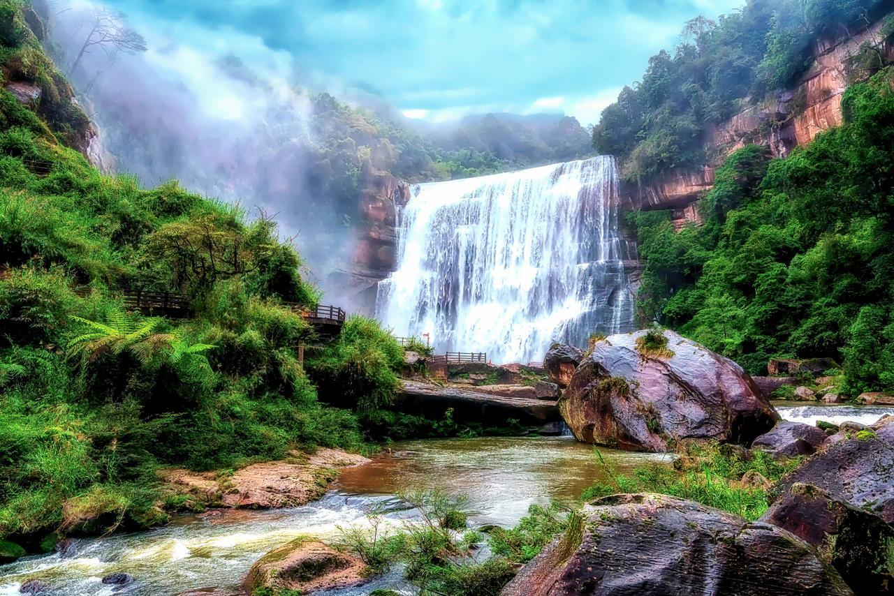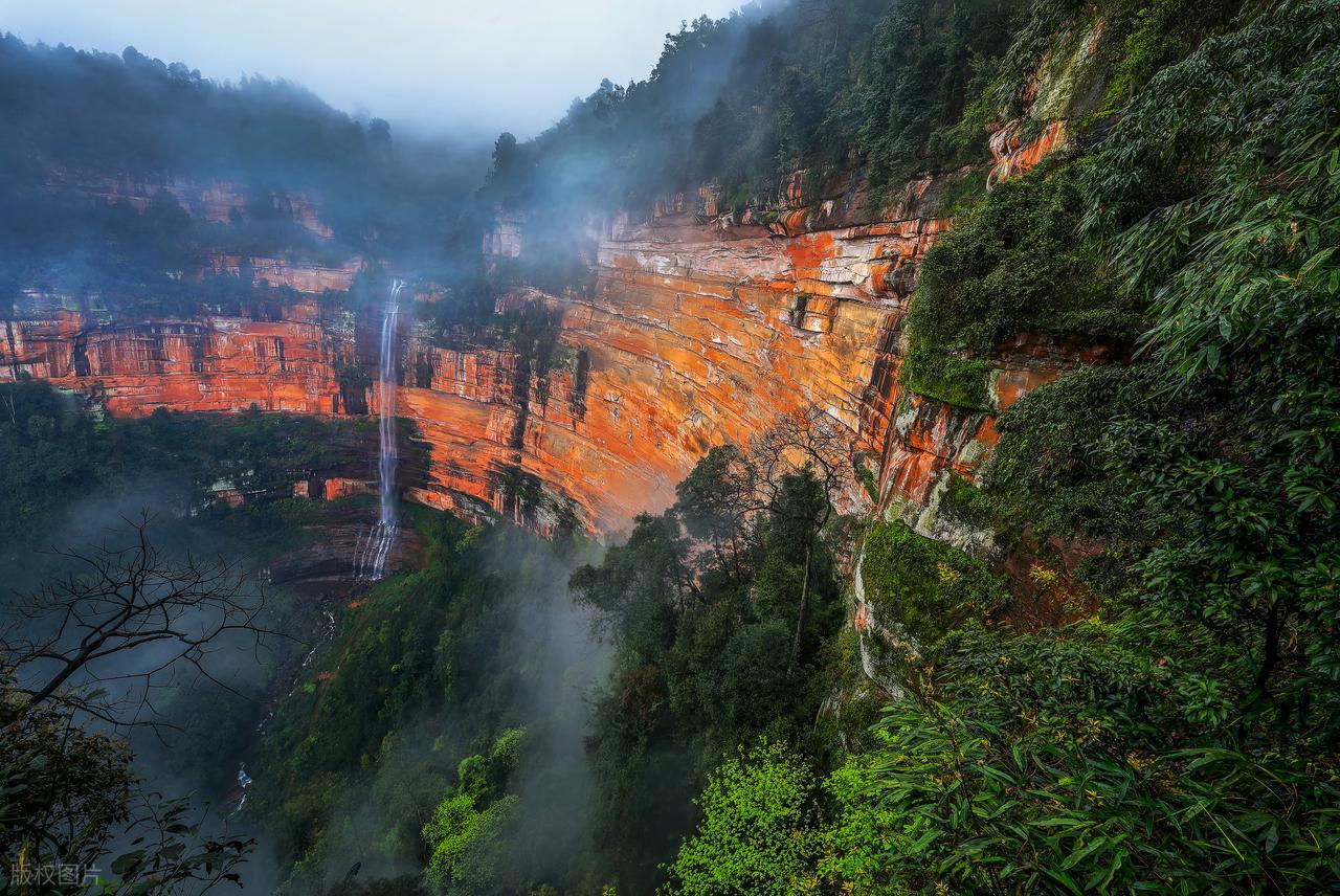 赤水大瀑布在丹霞地貌的映衬中尤为壮观,徒步在原始丛林中,随处可见的和恐龙同时代的植物桫椤。燕子岩可以坐上缆车观看瀑布,一路欣赏绝壁之险。四洞沟观丹霞地貌与瀑布融合。