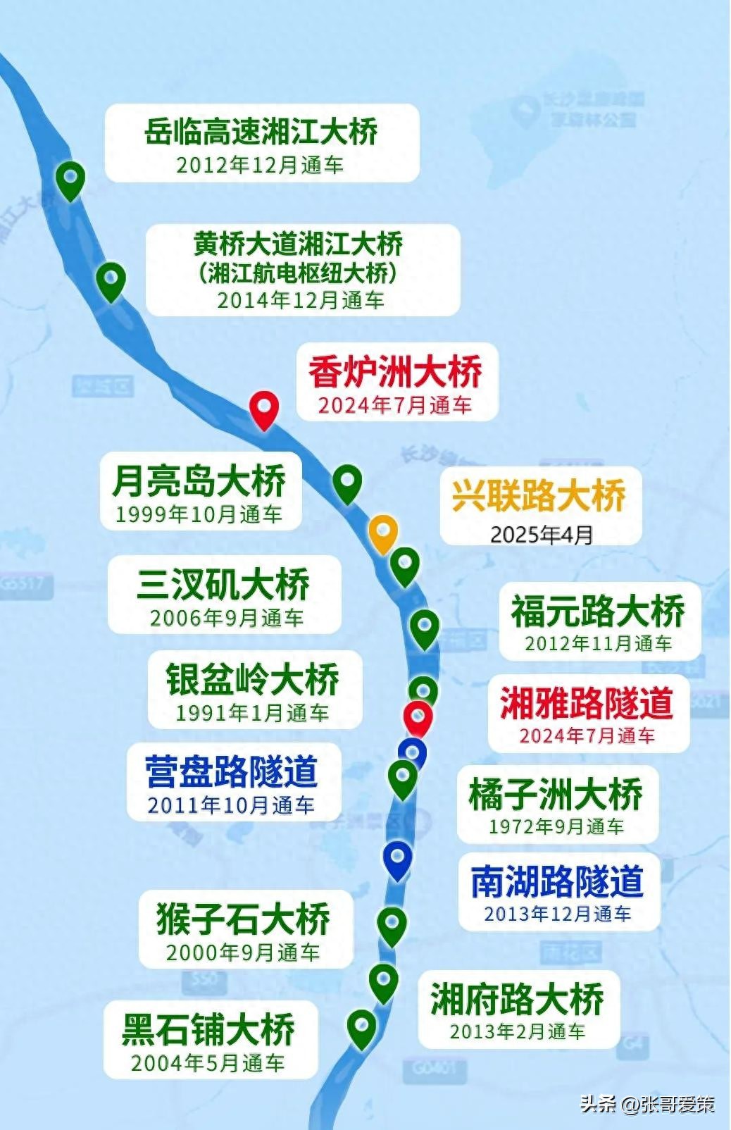 五十年来,长沙已有15条通车的过江通道,你们晓得几条,又走过几条。大家一起看看。