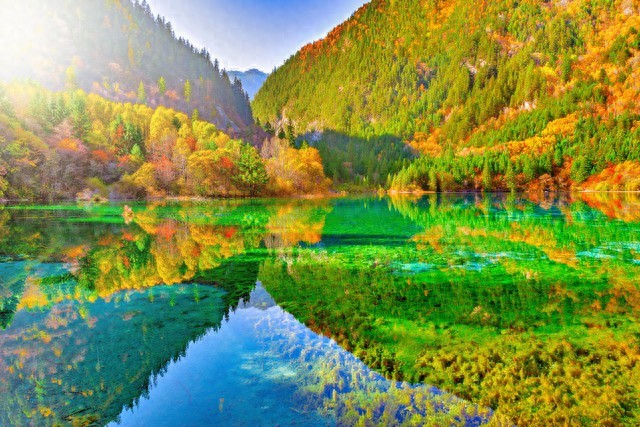位于四川省阿坝藏族羌族自治州,以108个翠海、叠瀑、彩林、雪峰、藏情闻名。钙华池群在阳光下折射出蓝绿交错的奇幻色彩,秋季层林尽染,湖水与彩叶交织如油画。2017年地震后部分区域修复重生,长海、五花海等核心景点仍保持着“九寨归来不看水”的绝美姿态。