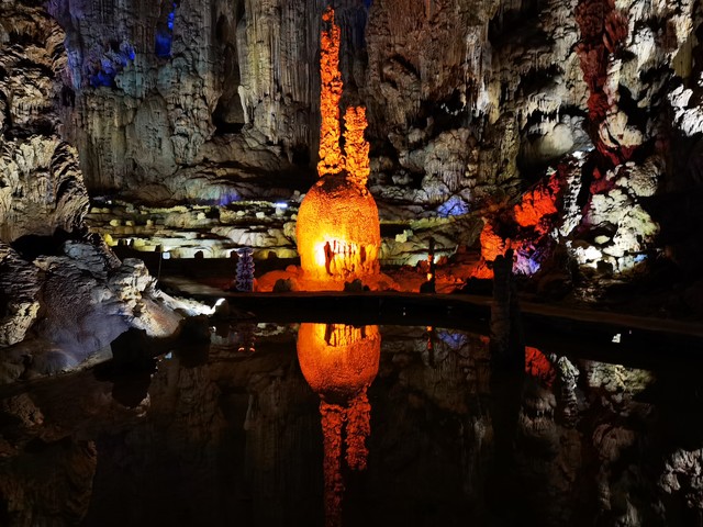 贵州毕节的“溶洞博物馆”,12.1公里洞道内遍布石笋、石幔、卷曲石。镇洞之宝“银雨树”高17米,通体晶莹;“霸王盔”直径达10米的盔甲状钟乳石群,在彩色灯光下如外星幻境。