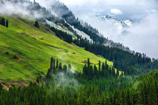新疆天山海拔1400-2700米处,40米高的云杉绵延千里,树干笔直如剑。林间马鹿穿梭,雪莲在岩缝绽放。冬季雾凇凝结成水晶森林,夏季牧场野花如繁星,哈萨克牧民的木屋炊烟点缀其间。