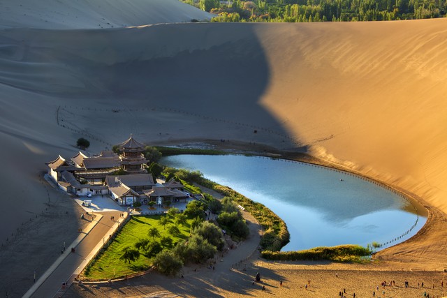 甘肃敦煌鸣沙山环抱的一弯清泉,形如新月,千年不涸。沙水共生奇观被誉为“沙漠之眼”,黄昏时驼队剪影掠过沙脊,泉边古亭飞檐与芦苇摇曳相映。尽管地下水位下降曾令其萎缩,但人工回灌工程让这丝路明珠得以延续传奇。