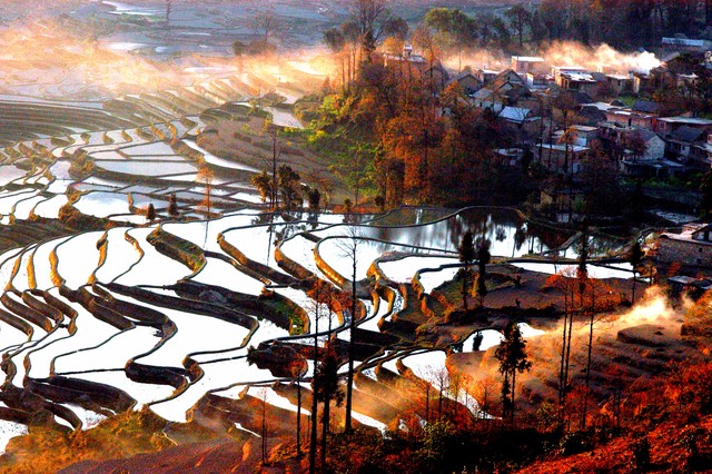 云南红河哈尼族开垦的19万亩“大地雕塑”,已列入世界遗产。多依树的日出云海、坝达的日落镜面、老虎嘴的险峻曲线,展现哈尼族千年农耕智慧。每年12月至次年3月注水期,梯田如万千银镜镶嵌山间,被誉为“天堂的阶梯”。