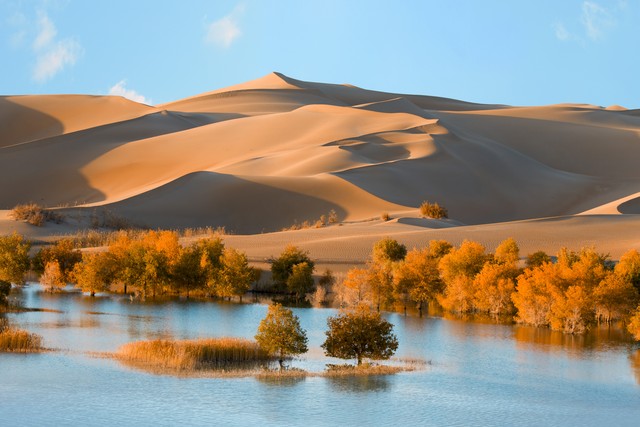 内蒙古阿拉善的沙漠奇迹,以“沙山与湖泊共存”闻名。必鲁图峰(海拔1611米)是世界最高沙峰,144个湖泊如蓝宝石散落沙海。粉红湖“达格图”因卤虫呈现梦幻色彩,湖畔的巴丹吉林庙已屹立300年,见证沙漠生灵的顽强。