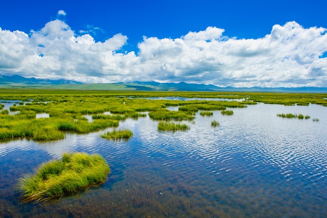 川甘交界的“高原肾”,中国最大泥炭沼泽湿地。黑颈鹤在花湖起舞,黄河在此温柔九曲,红军长征“草地”的悲壮与藏族牧歌的悠远在此交织。夏季野花铺天盖地,牦牛如黑珍珠散落绿毯,经幡在风中传递高原的呼吸。