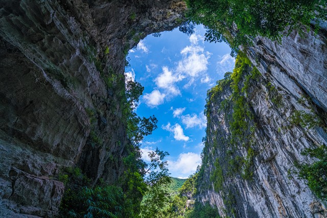 广西乐业的世界级喀斯特漏斗,垂直深度613米,足以吞下整座上海中心大厦。坑底原始森林藏着恐龙时代的桫椤,地下溶洞中盲鱼游弋,云雾常如白纱缠绕坑口。科考队曾在此发现珍稀兰花与飞猫,悬空玻璃观景台俯瞰,犹如凝视“地球的瞳孔”。28个天坑群组成的“地质博物馆”,见证2亿年流水蚀刻的洪荒之力。