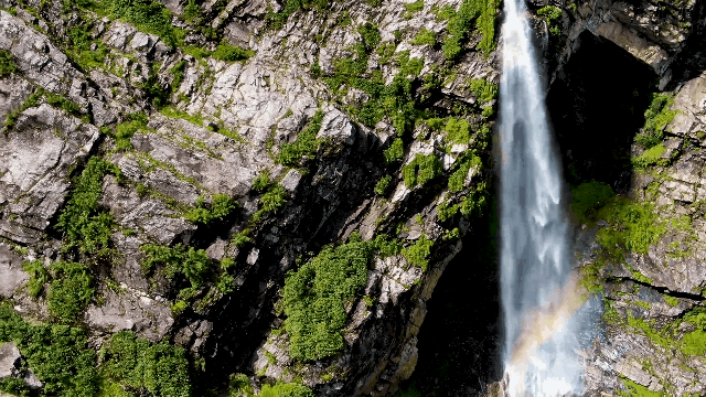 老虎嘴瀑布,从雪山上倒悬而下,至半空被峭石拦腰截断,激起雪浪后再沿着绝壁陡然下坠。天气晴好时,太阳直射其上如彩虹悬挂,如梦似幻。