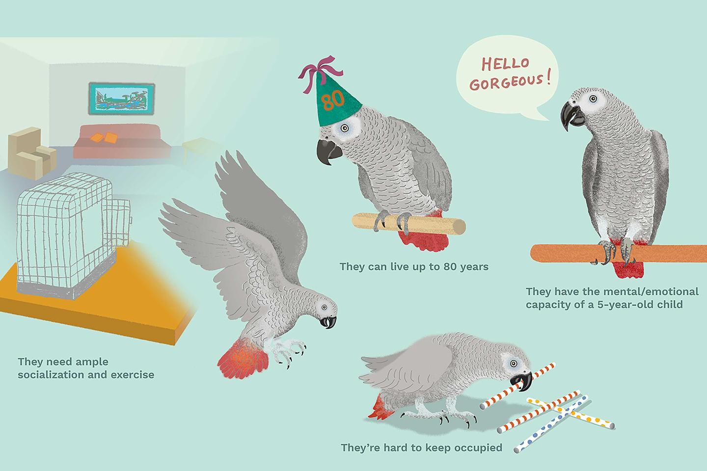 非洲灰鹦鹉的平均寿命约60年,正因为灰鹦鹉的长寿,很少有饲养者能够为它们提供一个长期稳定的圈养环境。