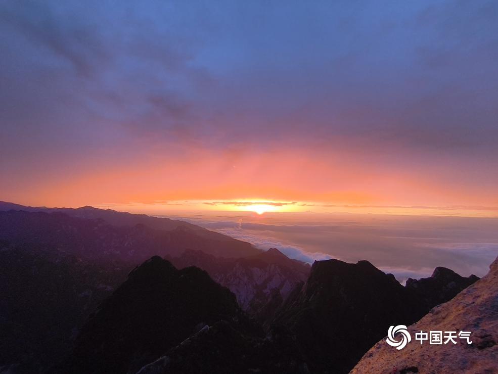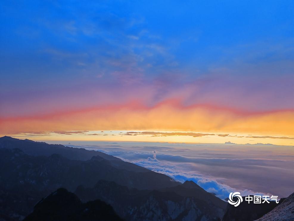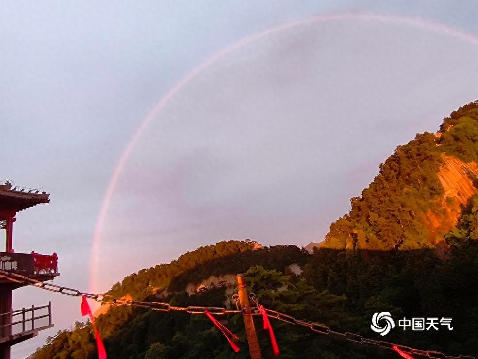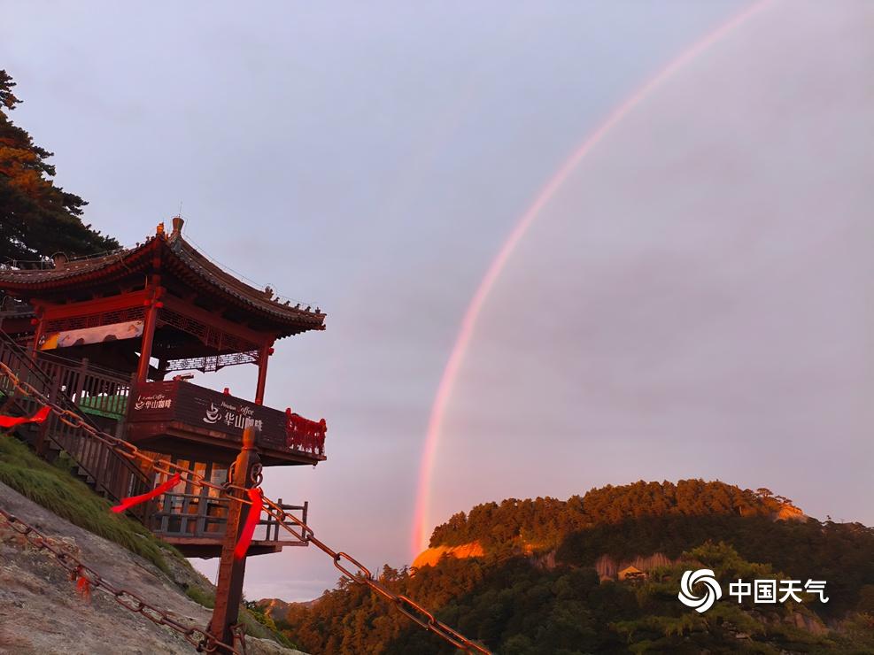 中国天气网讯 6月30日傍晚,华山阴雨暂歇,天空被彩霞晕染出绚丽的渐变效果,与山间翻涌的云海完美交融,一道彩虹横跨两峰,勾勒出一幅梦幻般的画卷。(图文/谭怡颖)