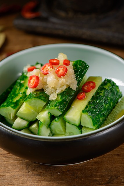 黄瓜买带刺的才新鲜。以前切片发现不好吃,后来学用刀背敲碎再掰,这样不散还能入味。调料就是蒜末、酱油、醋,多放点辣椒油更香。上周买了俩黄瓜,儿子光吃这个愣是没碰米饭。