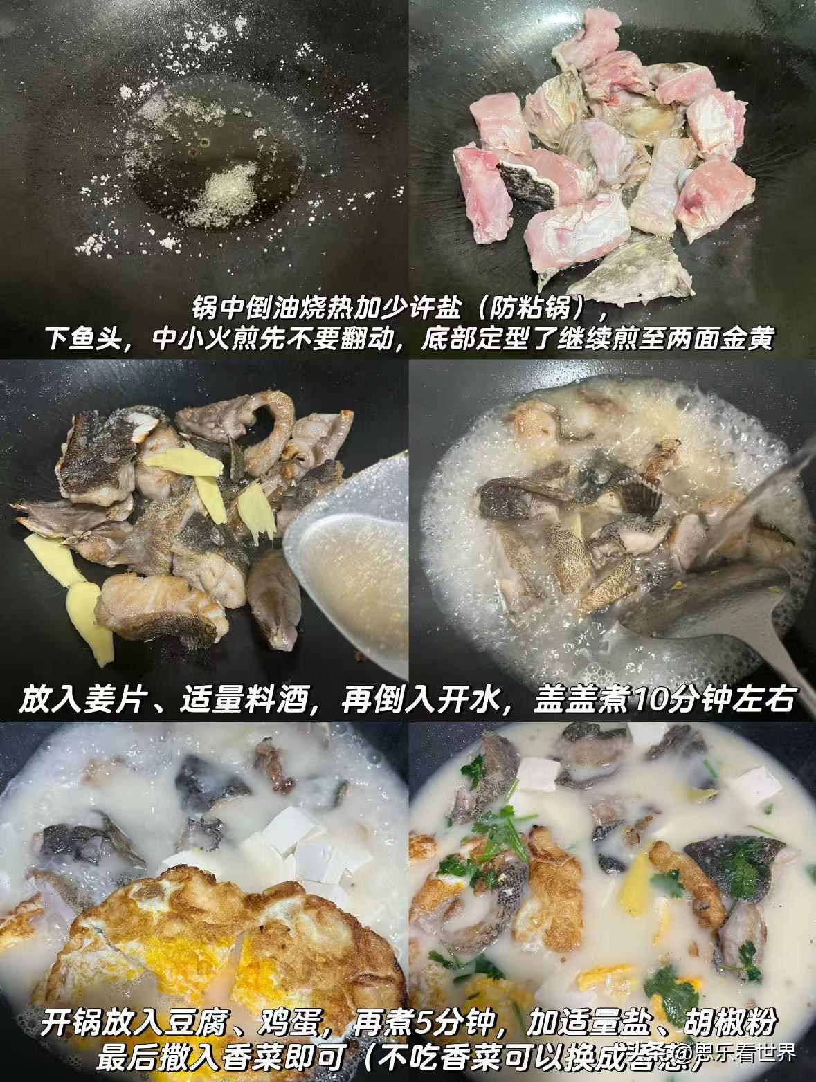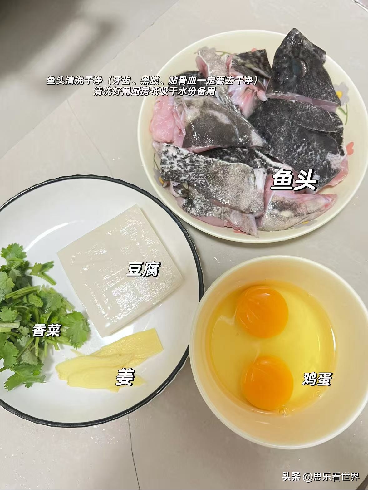 食材:鱼头、豆腐、香菜、姜、鸡蛋。