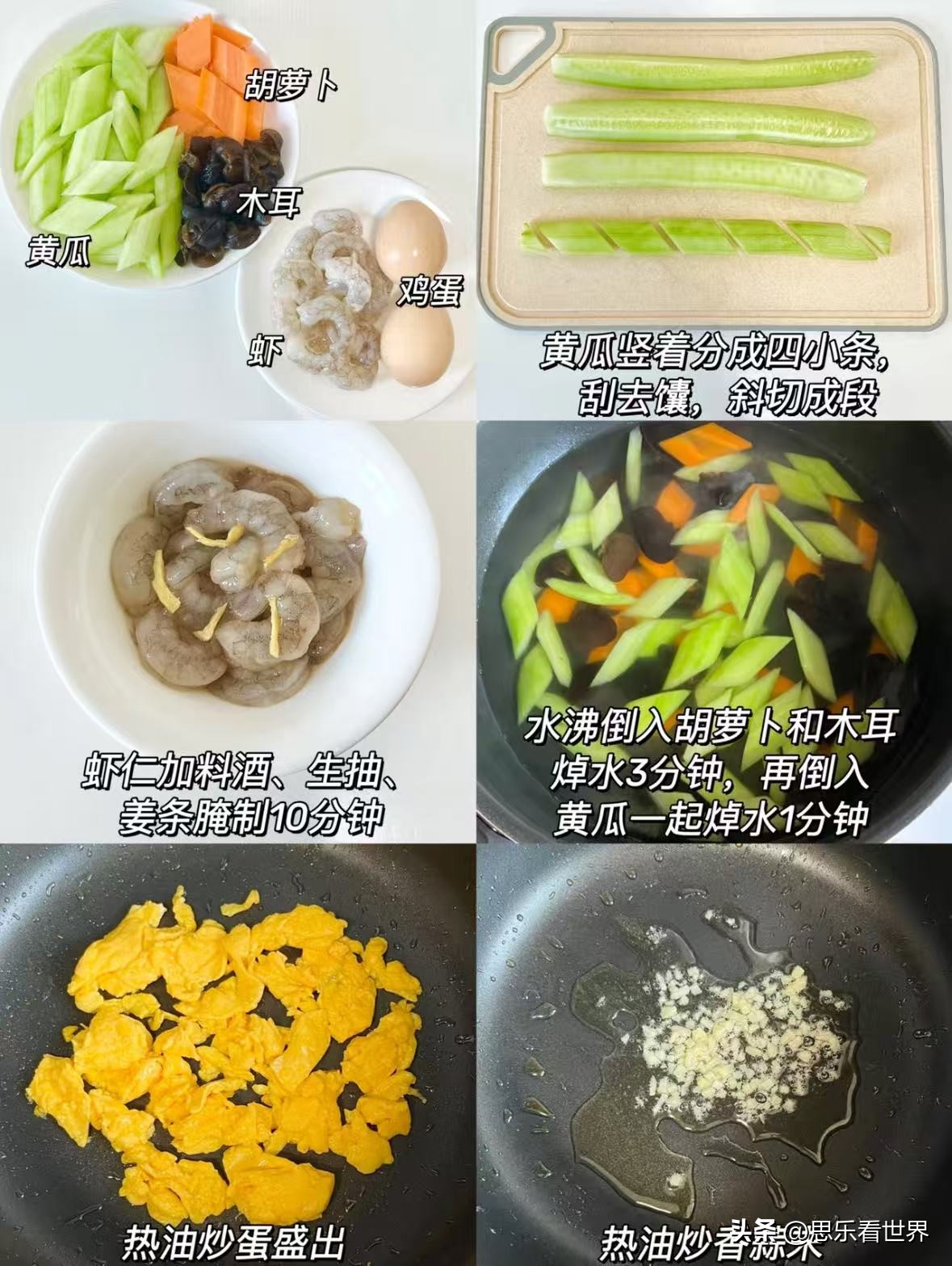 1.黄瓜切条去瓤斜切段;虾仁加料酒、生抽、姜条腌 10 分钟;