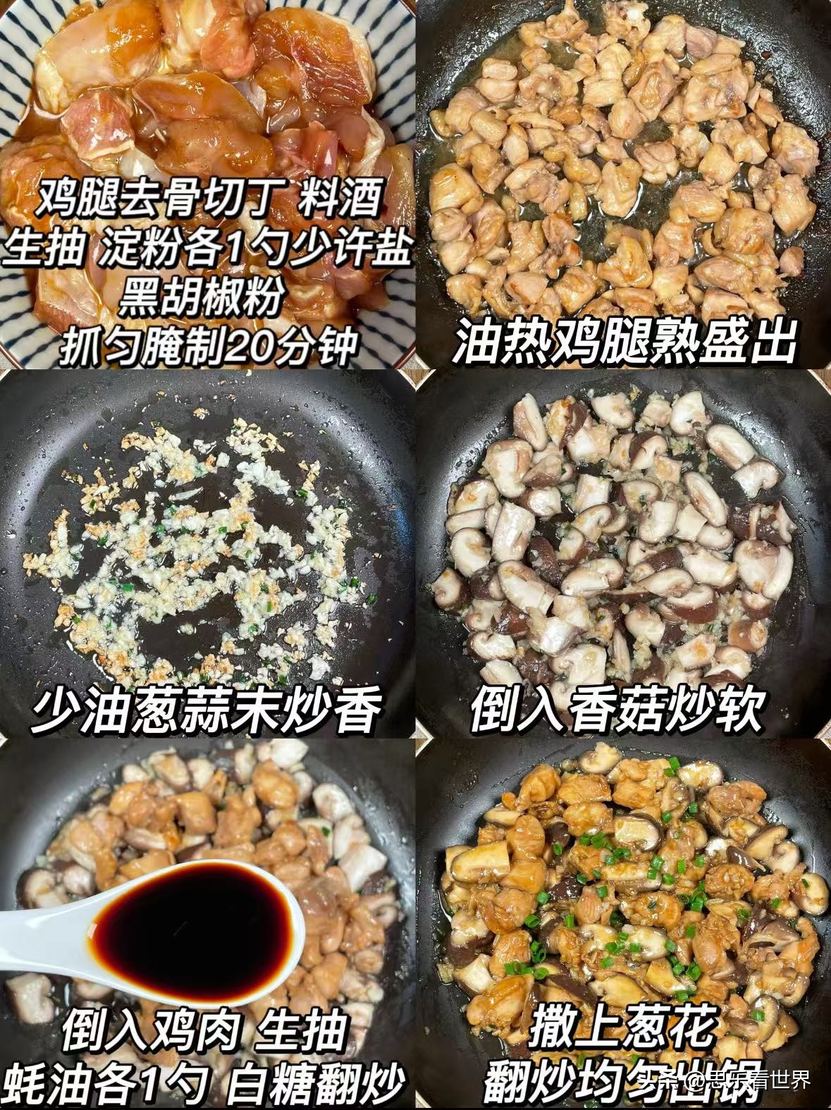 1.鸡腿去骨切丁,加 1 勺料酒、1 勺生抽、1 勺淀粉、少许盐和黑胡椒粉抓匀,腌制 20 分钟;油热炒鸡腿至熟盛出。