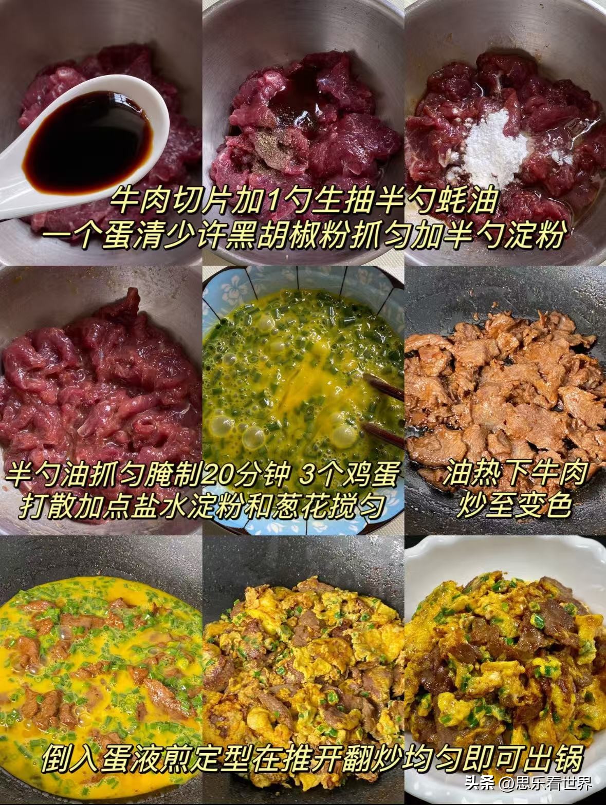 食材:牛肉、生抽、蚝油、蛋清、黑胡椒粉、淀粉、食用油、鸡蛋、盐、葱花。