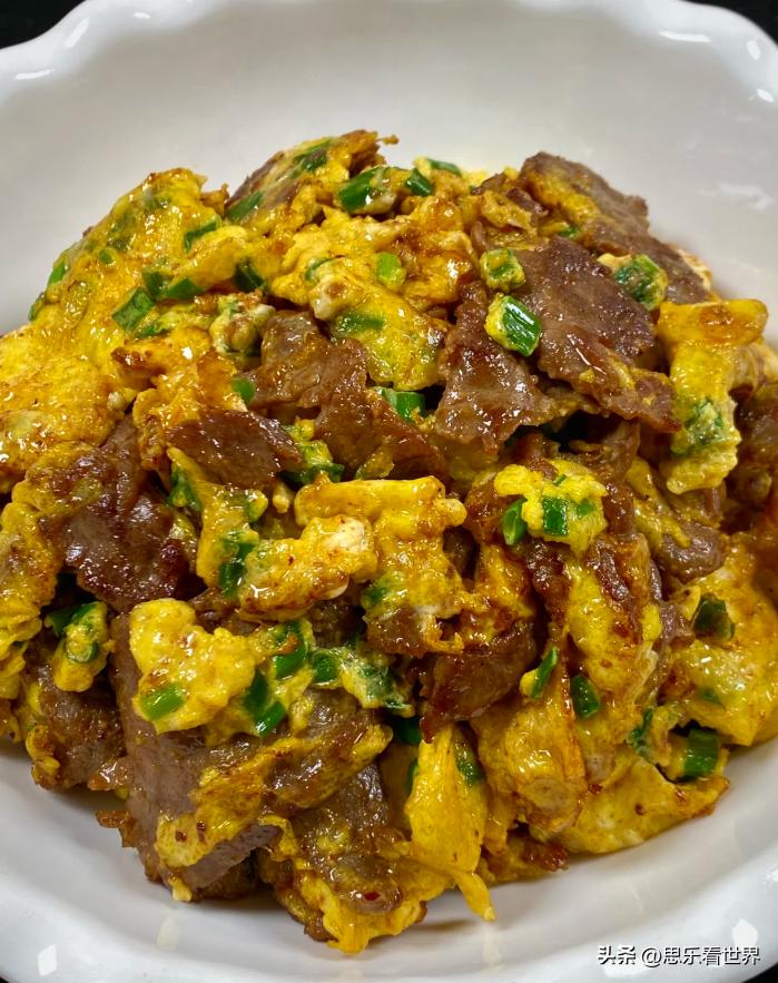 2.3 个鸡蛋打散,加盐、水淀粉、葱花搅匀。油热下牛肉炒至变色,倒入蛋液,煎定型后推开翻炒均匀,即可出锅。