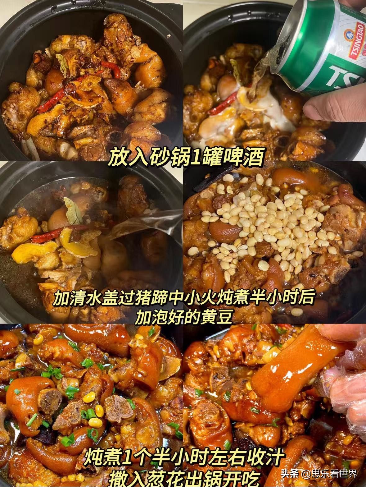 3.放入砂锅,加 1 罐啤酒、清水没过猪蹄,中小火炖半小时,加泡好的黄豆,再炖 1 个半小时收汁,撒葱花出锅。