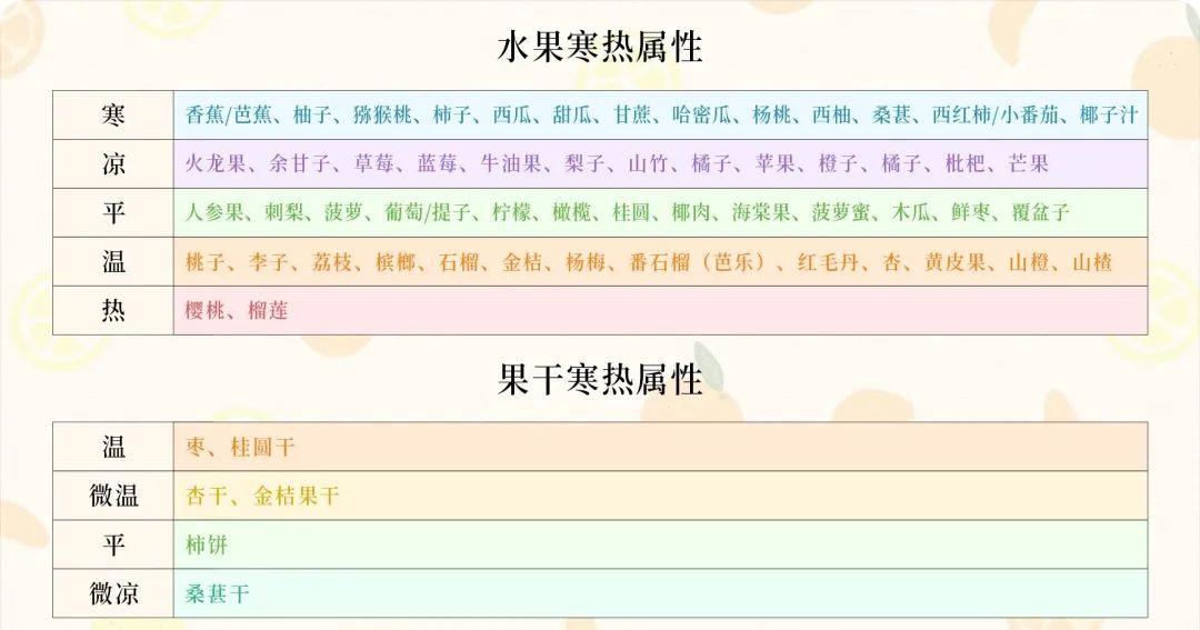 因为大部分的水果,都是寒凉之物,不信你看看下面这张图,涵盖了大多数水果的属性,可以收藏起来,以便随时查看。