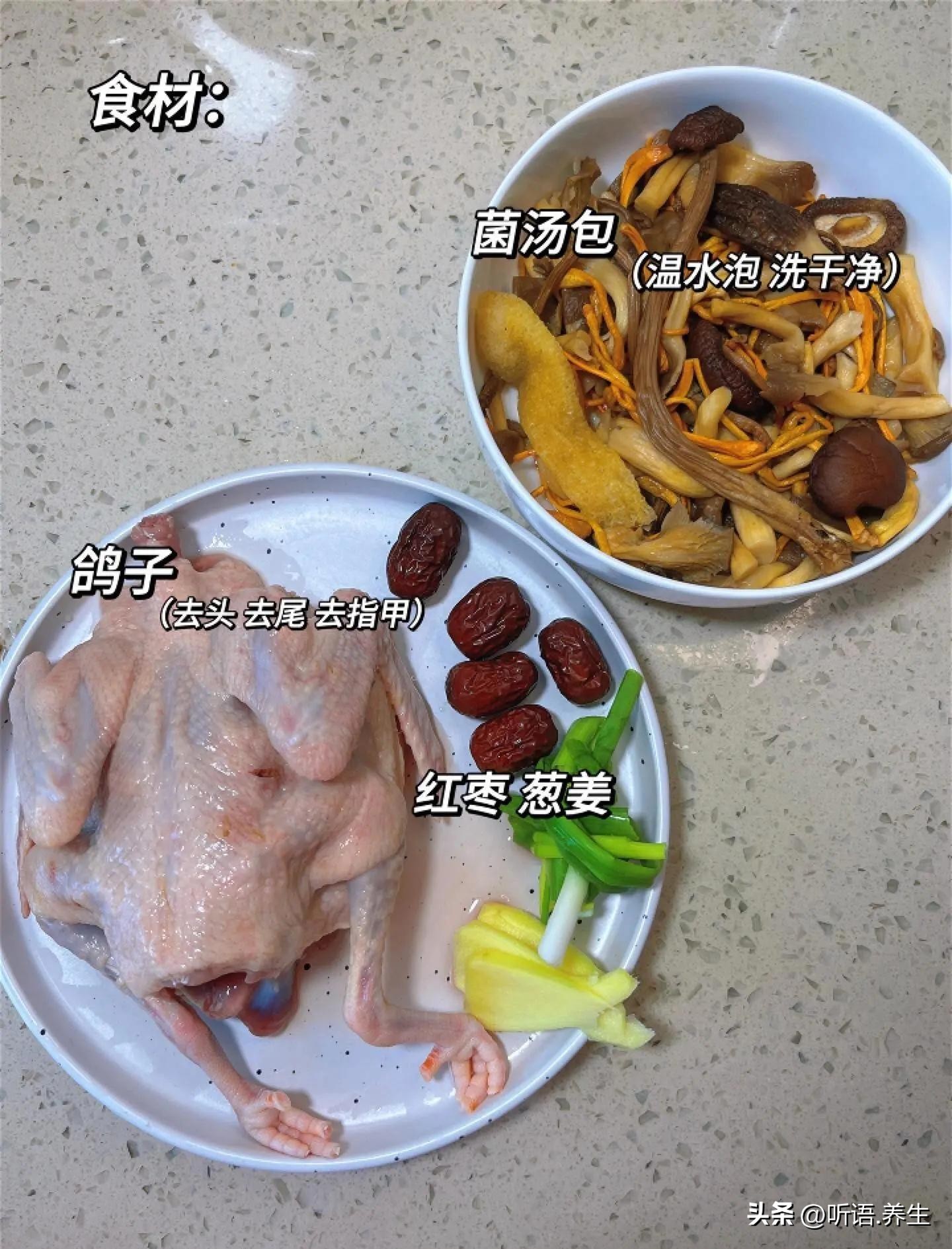 - 鸽子 半只~1只- 香菇 3~4朵- 金针菇 一小把- 枸杞 少许- 姜片 2~3片- 盐 适量