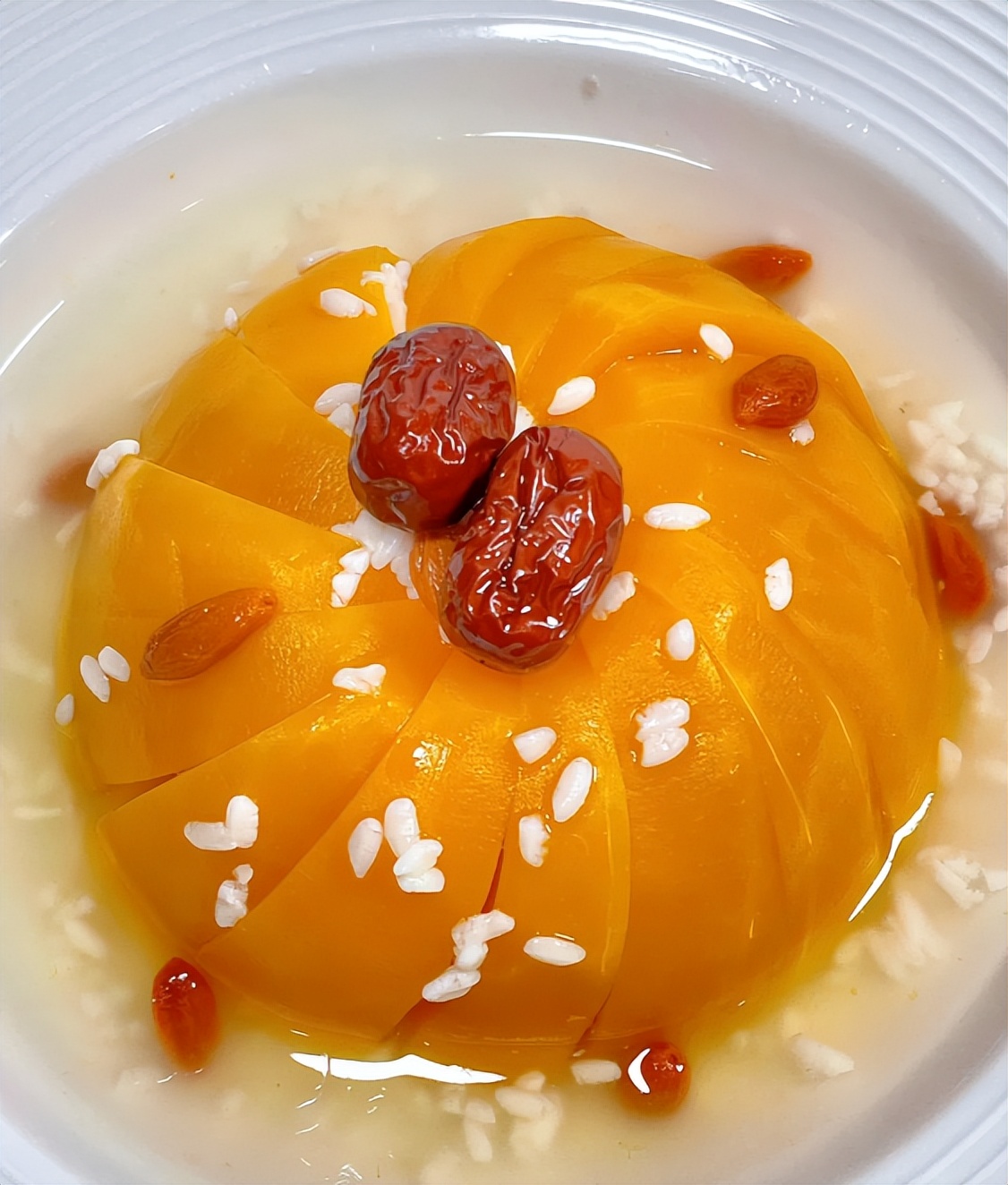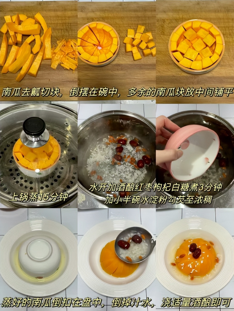 食材:南瓜 1 个、酒酿、红枣、枸杞、白糖、水淀粉