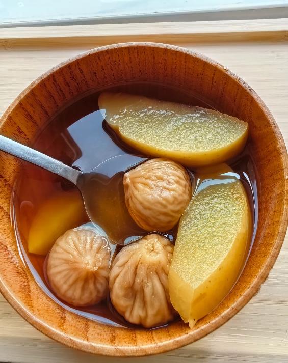 2.锅中放清水、苹果块、无花果、红糖,大火烧开后转小火煮 20 分钟,至食材软烂即可。