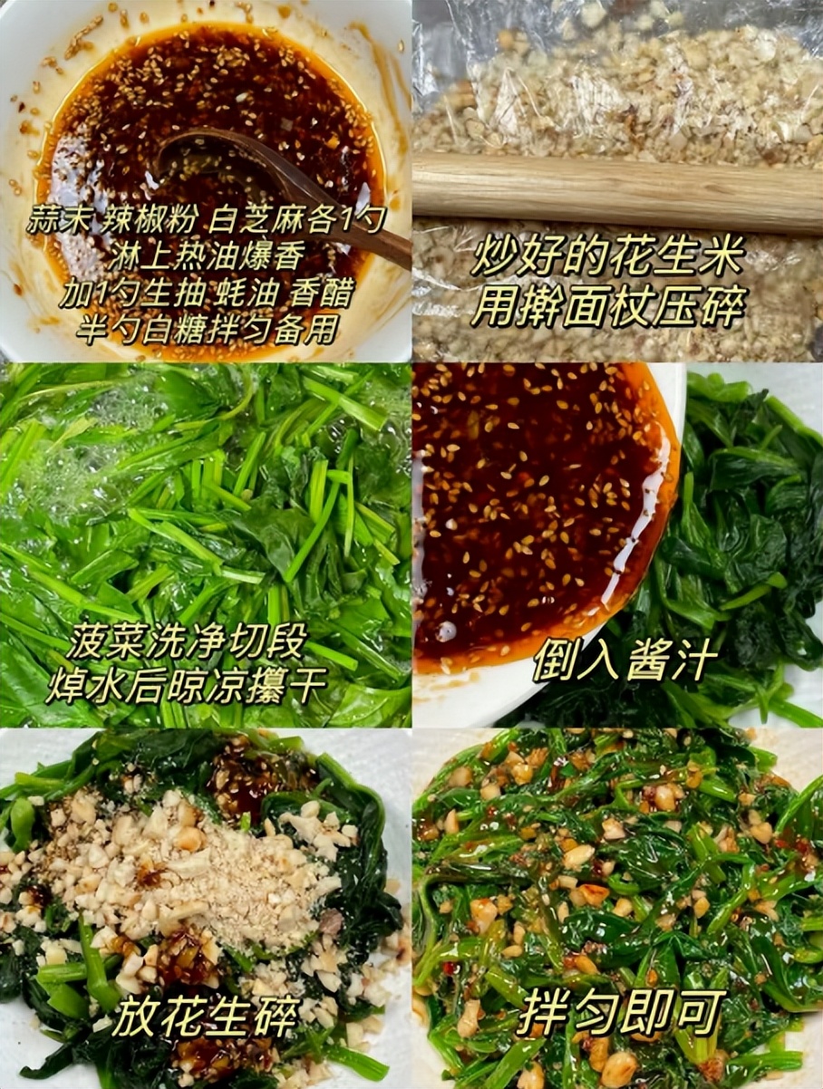 食材:菠菜 1 把、蒜末、辣椒粉、白芝麻、花生米、生抽、蚝油、香醋、白糖、热油