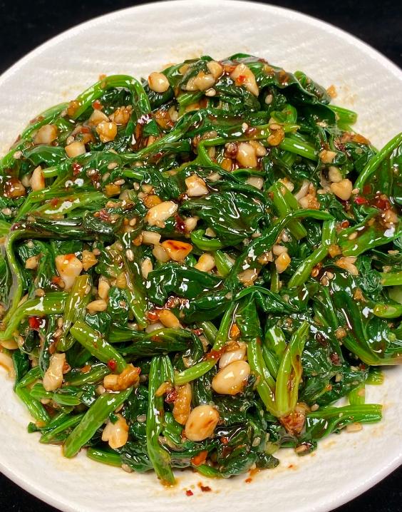3.菠菜装盘,浇酱汁、撒花生碎,拌匀即可,清爽解腻超下饭 。