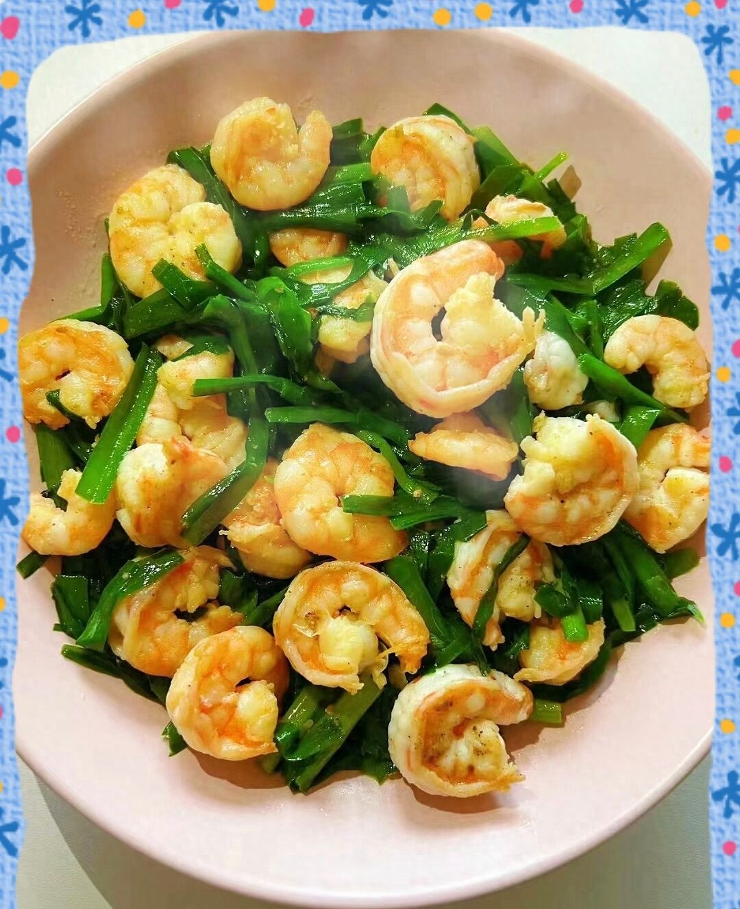 锅里再来一点油,韭菜大火下锅,翻个十来下就行,立刻把虾仁倒回去,撒盐,快速合一下出锅。