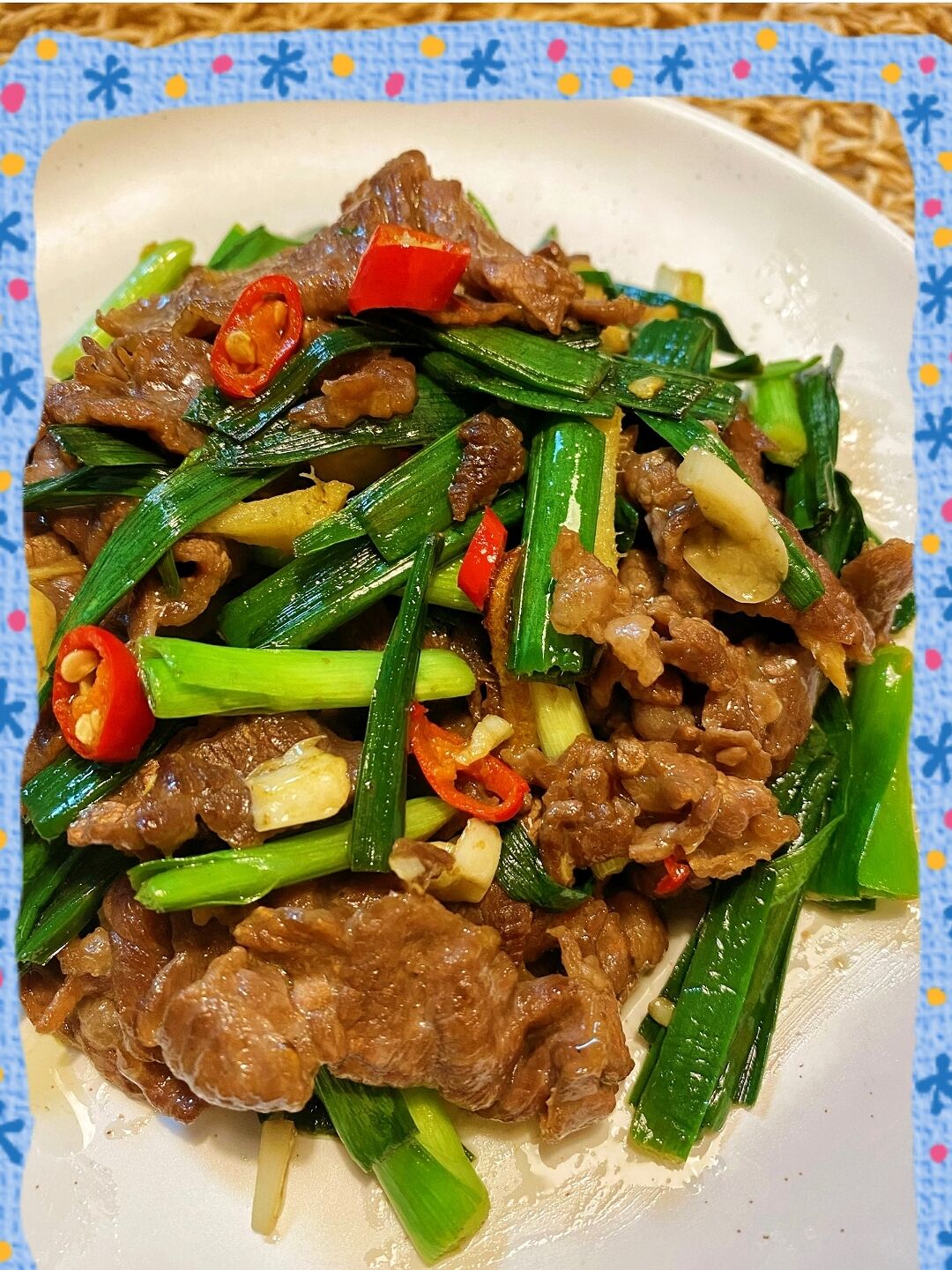 锅里留底油,下蒜白炒香,再下蒜叶翻两下,把牛肉倒回去,点一点老抽上色,尝味再补盐,翻匀出锅。