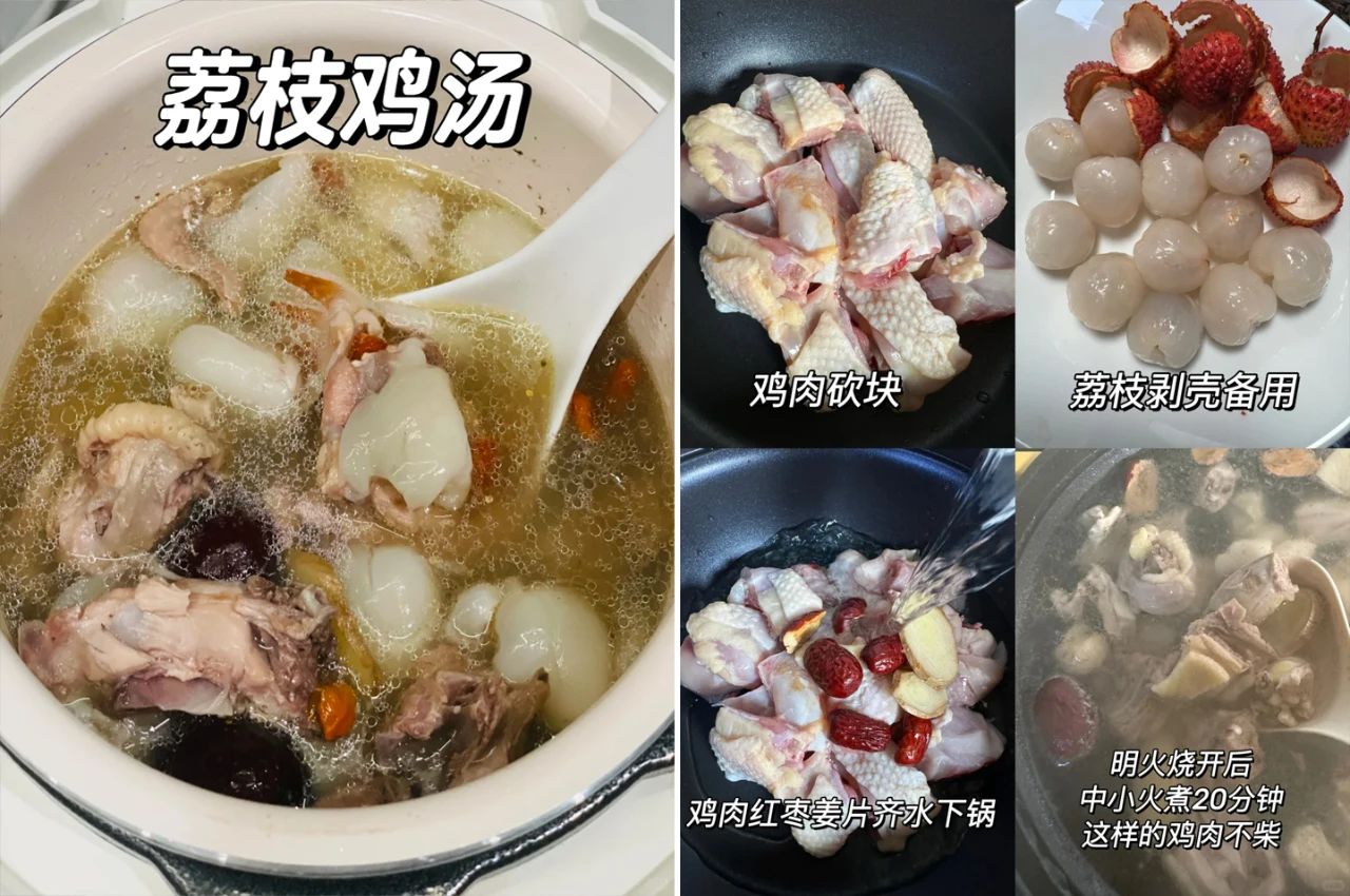 这道荔枝鸡肉汤将荔枝的盛夏气息融入到温补的鸡汤中,清甜不腻,尤其适合食欲不振的闷热时节。夏天老觉得疲惫、容易累的、喜欢喝冷饮又一直待在空调房的家人们特别适合喝!