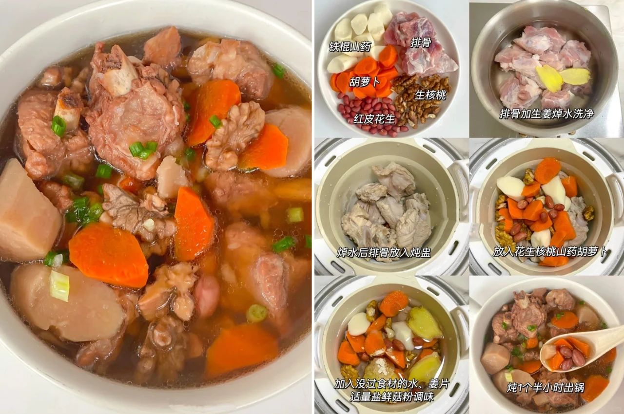 1、排骨加生姜焯水后放入炖盅中,再放入花生、核桃、山药、胡萝卜