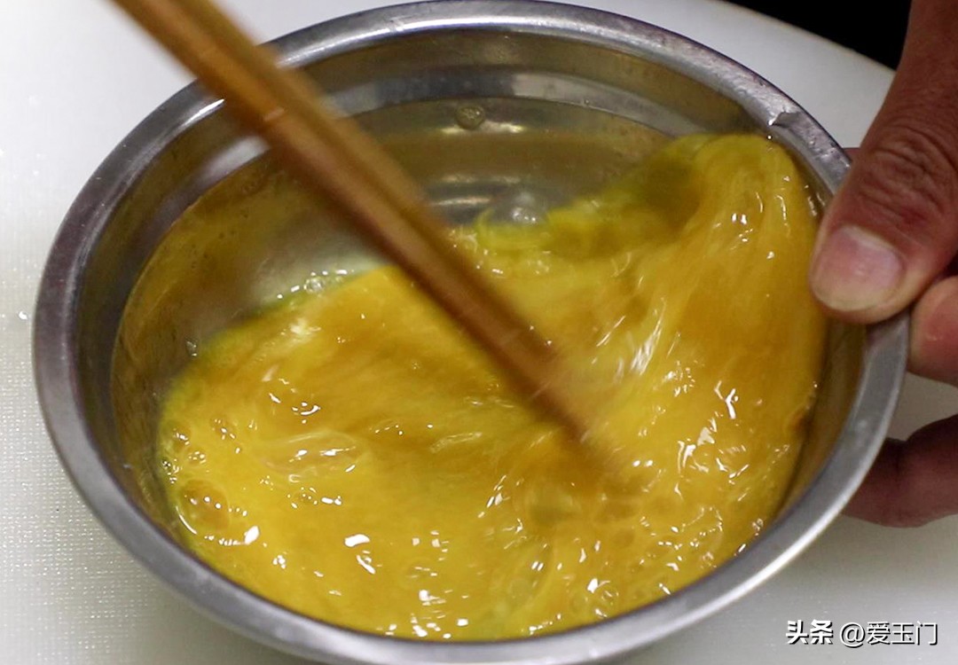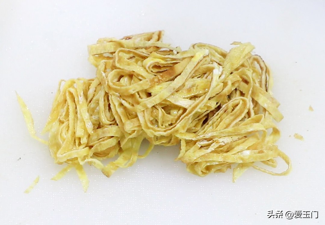 4.锅内烧油,充分滑锅以后倒出热油,倒入一半鸡蛋液均匀铺在锅边,鸡蛋液全部定型以后,从锅边淋入少许植物油方便鸡蛋饼脱离,蛋饼周围打卷时翻面,两面都煎成金黄色时即可出锅,把煎好的蛋饼叠在一起,切成均匀细丝。