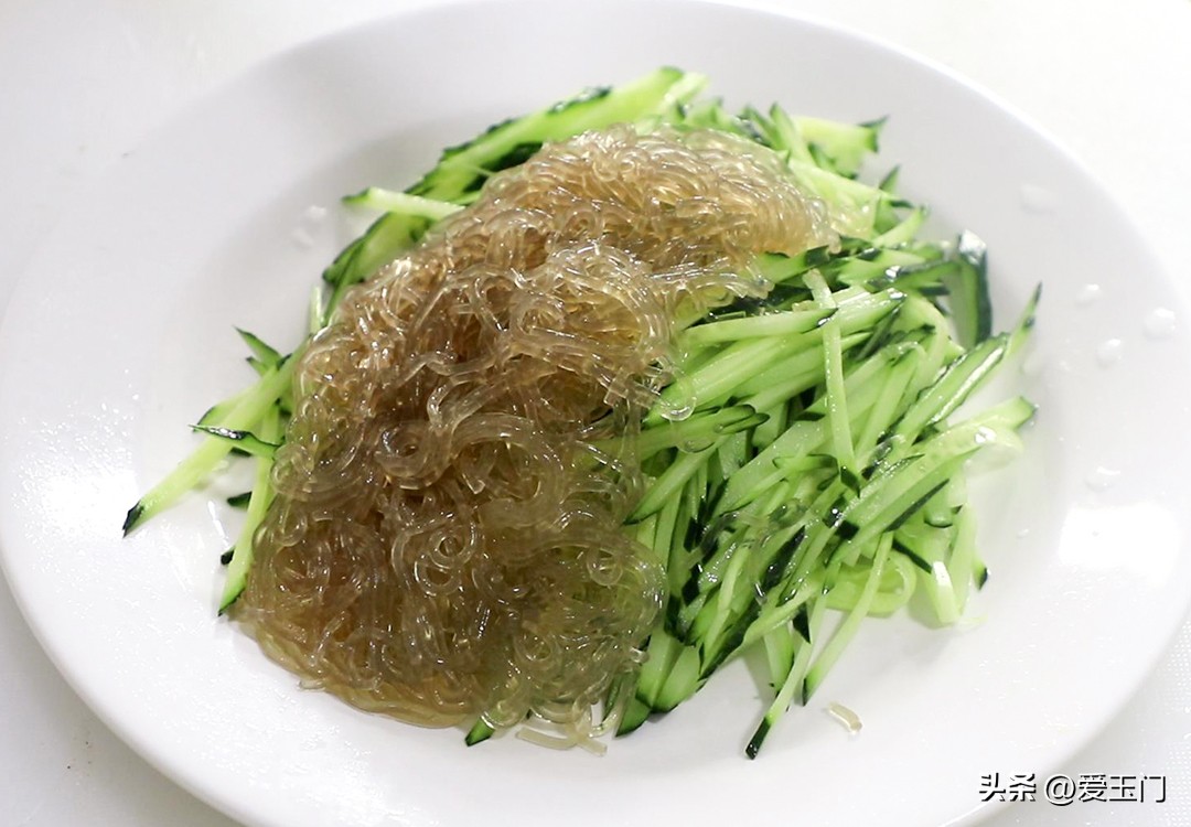 2.准备洗净的黄瓜一根,先斜刀切成片再改刀成均匀细丝,把控过水的粉条和黄瓜,放在一起备用。