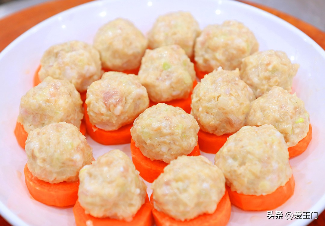 4.抓适量的馅料在手心里团成圆球,馅料比较黏手时可以在手上沾点清水,把团好的丸子摆放在胡萝卜片上面。
