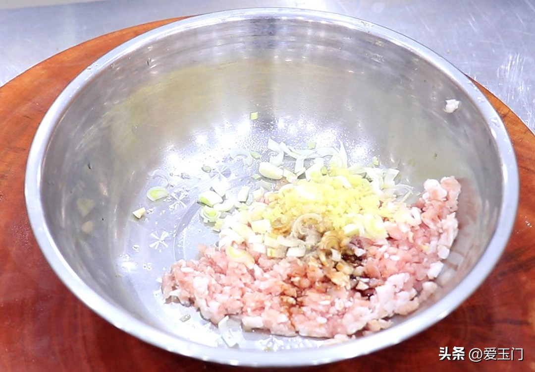 2.准备猪肉一小块,先切成片再剁成肉粒。大葱一段切成葱花。生姜一块切成姜末,和肉馅放在一起,加入食盐1克,胡椒粉1克,生抽5克,用筷子搅匀。胡萝卜一根切成片,摆放在盘中备用。