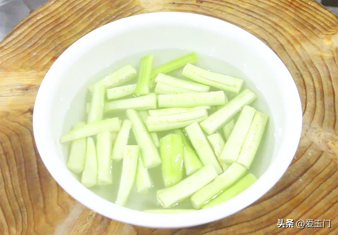 4.锅内烧水,水里加入植物油,水开后倒入丝瓜条,焯水30秒后倒出,水里加点植物油的目的,是焯过水的菜色泽发亮。