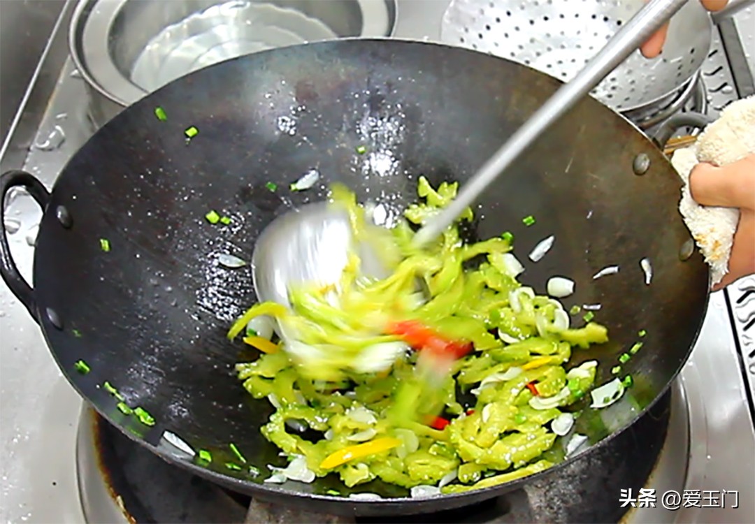 5.锅内烧油,倒入葱花,炒出香味,倒入苦瓜和百合,加入适量的白糖、食盐、味精、鸡粉、芝麻油,快速翻炒后就可以出锅装盘了。