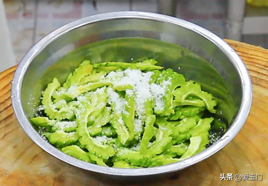 1.首先,准备苦瓜一根,从中间对半划开,用勺子挖去瓜瓤,苦瓜的瓜瓤苦涩味很得,一定要去除干净,切成厚一点均匀的片放在盆中,撒上适量的食盐和白醋,用手抓匀泡5分钟左右,减轻苦瓜的苦涩味。