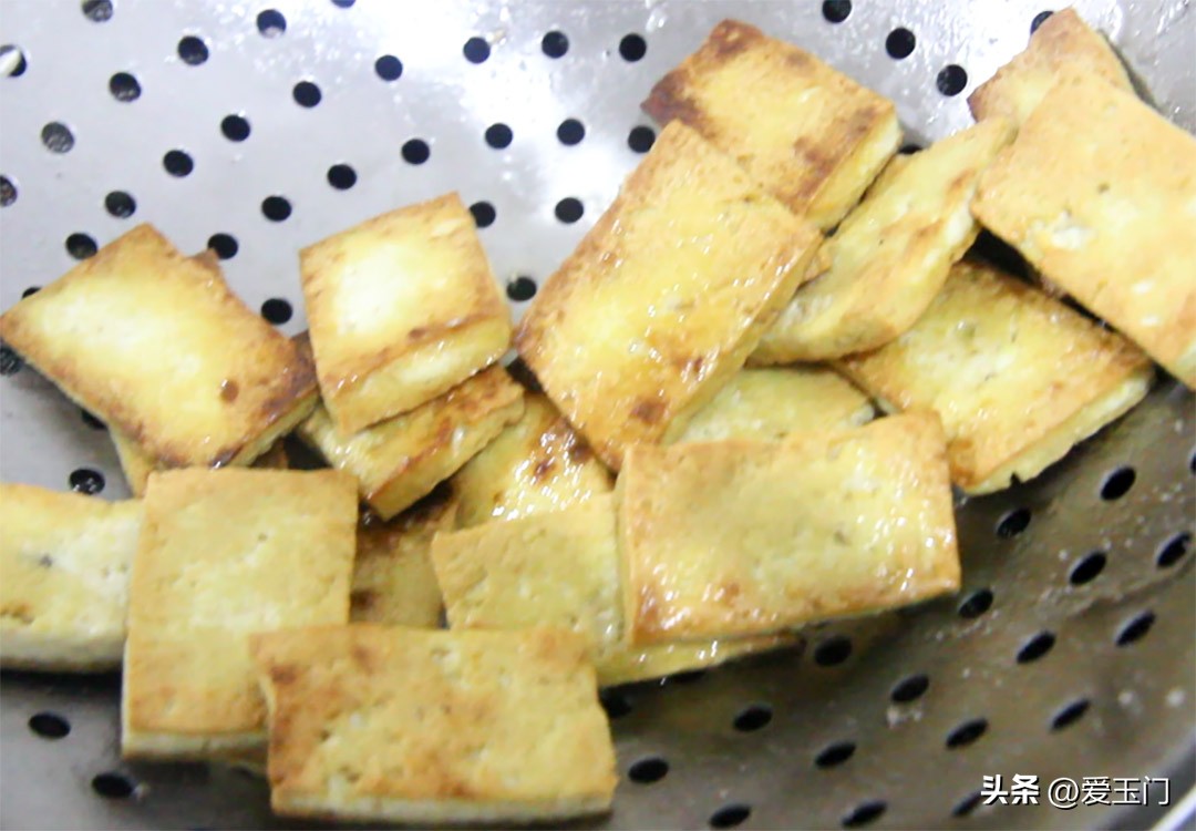 3.锅内烧油,烧至冒青烟,滑锅后倒出热油加入凉油,再倒入豆腐,热锅凉油才能在煎豆腐时不会粘锅,煎豆腐时要晃动锅,在豆腐上撒上少许食盐,让豆腐更加入味,翻到另一面,煎至金黄就可以倒入控油。