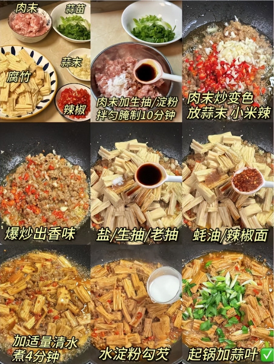 辣椒腐竹炒肉末,鲜辣的辣椒、筋道腐竹与嫩滑肉末碰撞,咸香微辣,口感层次丰富,妥妥的下饭神器!