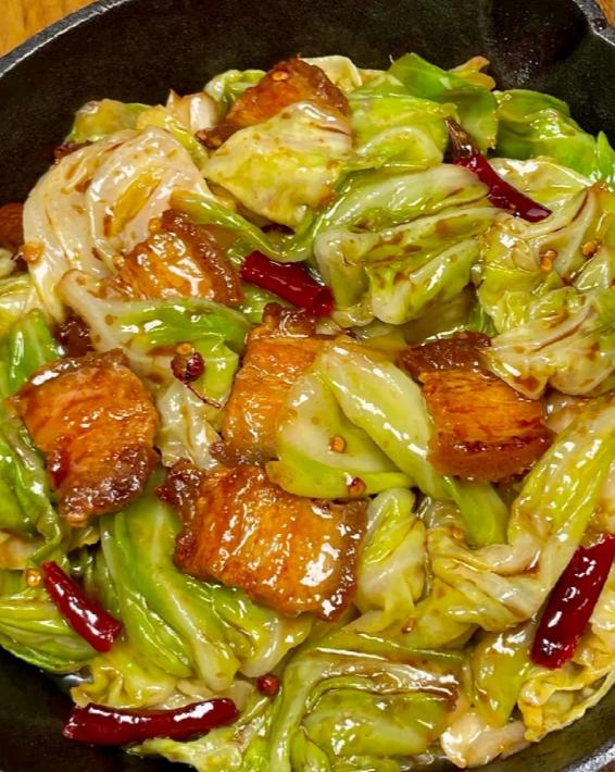 辣椒干手撕包菜炒五花肉,焦香五花肉油脂沁入脆嫩包菜,搭配辣椒干的辛香,脆爽解腻,咸辣开胃,一口就上头!