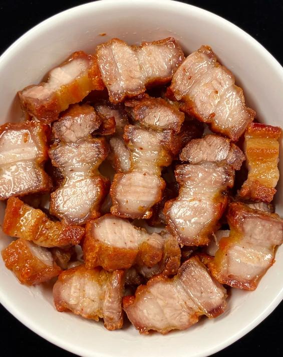 脆皮五花肉外皮酥脆咔嚓响,内里肥瘦相间,肥而不腻,瘦而不柴,咸香入味,油脂香气浓郁,咬下外脆里嫩超满足。