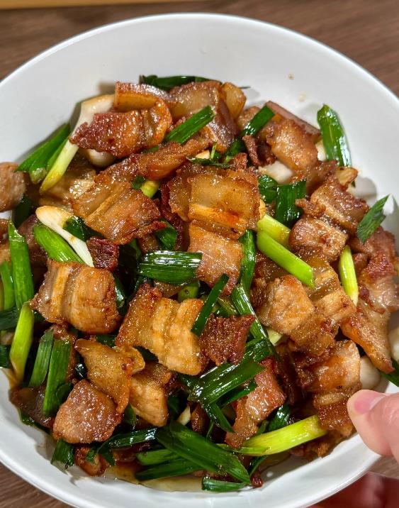 蒜苗炒五花肉咸香下饭,五花肉油润弹嫩,蒜苗脆嫩带清香,蒜香与肉脂香交融,咸鲜微辣,口感层次丰富,是家常下饭菜经典。