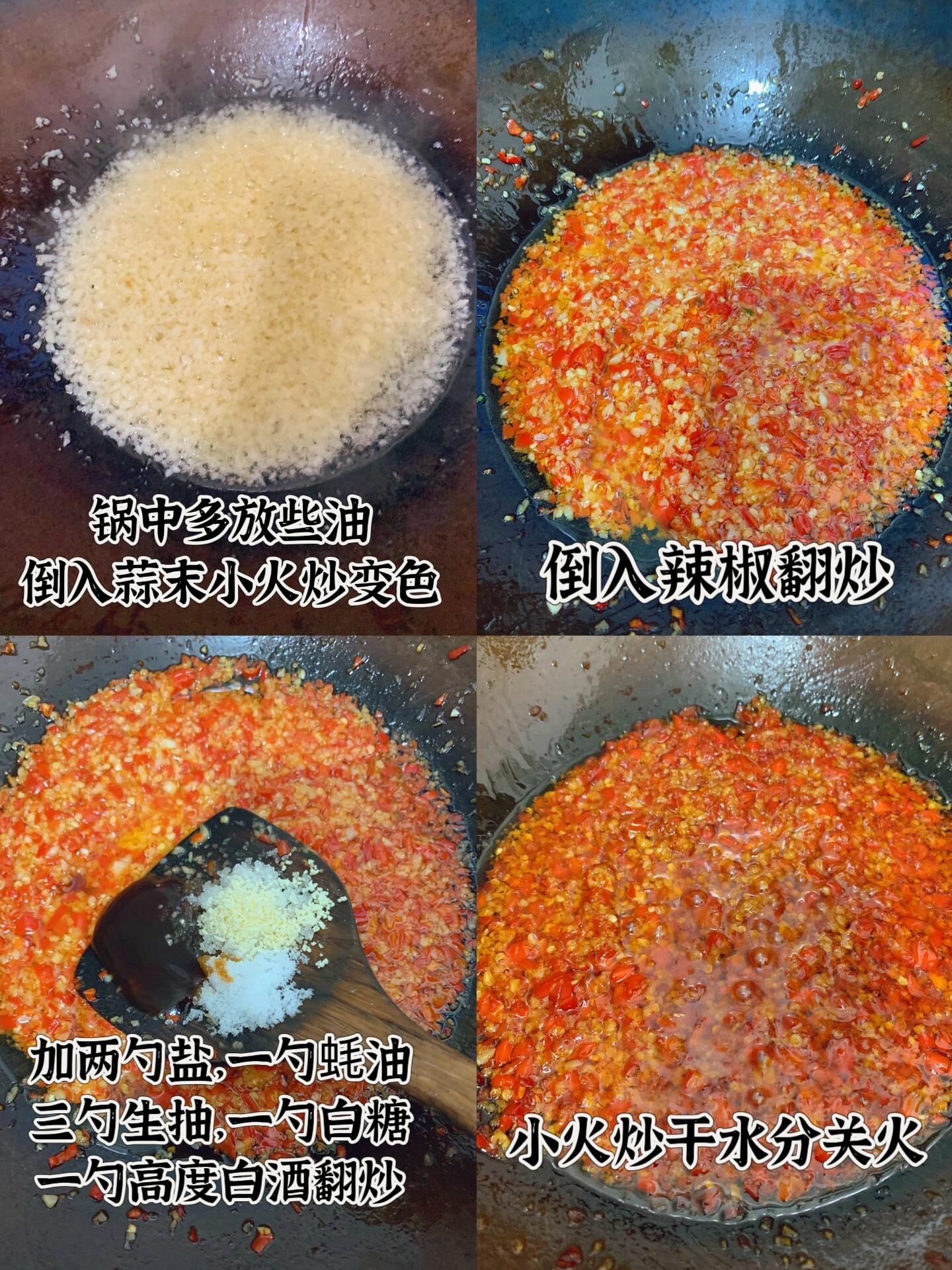 锅中多倒些油,先倒入蒜末小火熬至变色,然后再倒入辣椒,加入两勺盐,三勺生抽,一勺白糖,一勺蚝油,一勺鸡精调味,再加一勺高度白酒可以存放更久,全程小火把水份熬干就可以关火了~