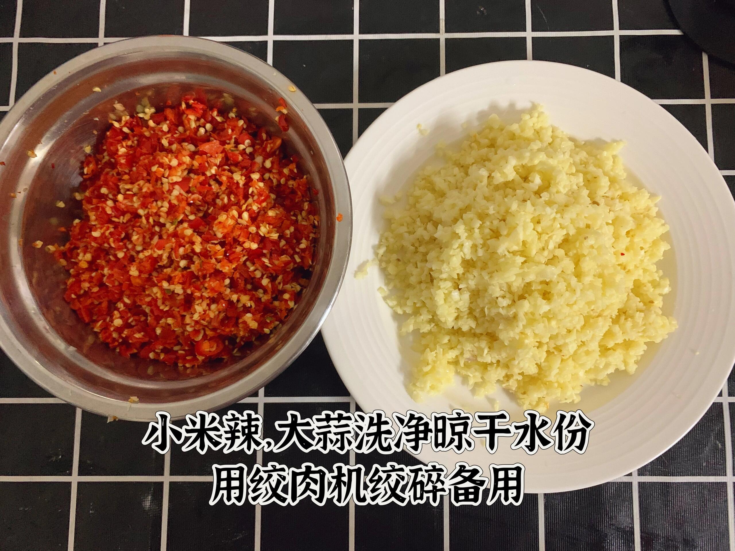 室友说辣椒要选二荆条和小米辣混合,二荆条增香,小米辣提辣。(我们家很能吃辣,所以我用的全都是小米辣)蒜要多,喜欢豆豉也可以加一点。
