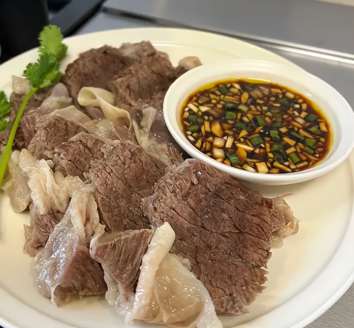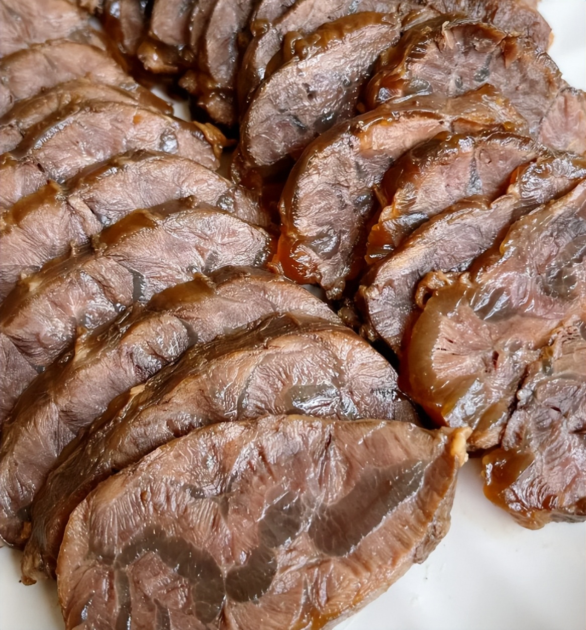 牛腱子是牛大腿上的肌肉,筋膜多,肌肉纤维分明,卤熟以后切片,能看到很漂亮的纹理。