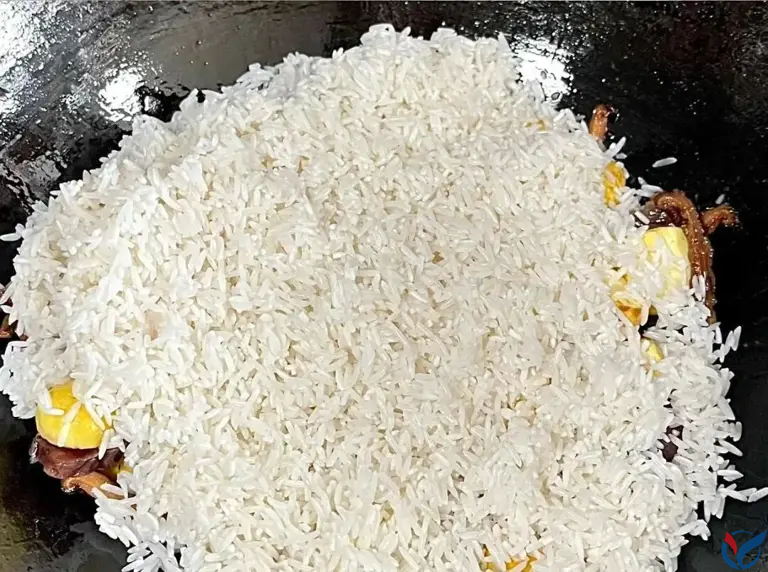3、加入洗干净的大米、生抽、老抽、少许糖和适量盐,快速翻炒均匀,让米饭更有色泽、更入味。
