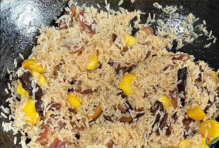 煮熟的腊肠焖饭,一开盖就会有一股浓郁的腊肠香混合着板栗的甜味扑鼻而来,粒粒分明的米饭金黄油亮。最后撒上些葱花提香,色香味俱全的晚餐就完成了。